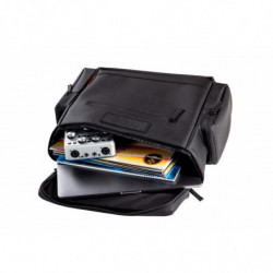 FUNDA PARA EQUIPO DJ La MP-DJ1 contiene todo el equipo un que un DJ necesita, Además de los vinilos de 12 pulgadas, también admite un MacBook de 17 pulgadas o un ordenador portátil Windows de 15 pulgadas, así como auriculares, una interfaz de audio y cables USB. Tiene una capacidad aproximada de veinticinco discos de vinilo de 12 pulgadas (LPs). El panel posterior está equipado con un cojín de malla, lo que garantiza la ventilación de la espalda del usuario, incluso al usar la funda durante un tiempo prolongado. Fabricada enPVC repelente al agua.