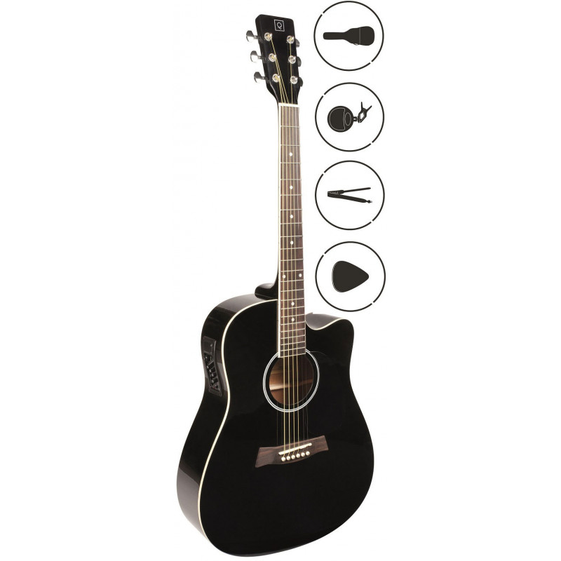 PACK DE GUITARRA ACUSTICA Pack de guitarra electroacústica tipo dreadnought. Cutaway. Tapa de abeto. Aros y fondo de tilo. Mástil de catalpa. Diapasón y puente de 'compound rosewood'. Clavijero Die-Cast cromado. Previo activo EQ7545 con control de volumen, presencia y ecualizador de 3 bandas. Acabado negro brillante. Accesorios incluidos: funda, afinador digital de pinza, correa y 3 púas.