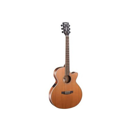 GUITARRA ELECTROACUSTICA DE 6 CUERDAS CON CUTAWAY Guitarra acustica electrificada de aros estrechosde 83mm. Tapa solida de cedro. Aros, fondo y mástil de caoba. Diapasón y puente de palo rosa. 20 trastes. Escala 25.3'. Pastilla Sonicore. Previo Fishman Isys Plus EQ. Acabado Natural Satin.