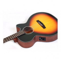 GUITARRA ELECTROACUSTICA DE 6 CUERDAS CON CUTAWAY Guitarra acustica electrificada de aros estrechosde 83mm. Tapa de abeto. Aros, fondo y mástil de caoba. Diapasón y puente de palo rosa. Mástil en forma de V. 20 trastes. Escala 25.3'. Pastilla ceramica. Previo Cort CE304T. Acabado 3 Tone Satin Sunburst.