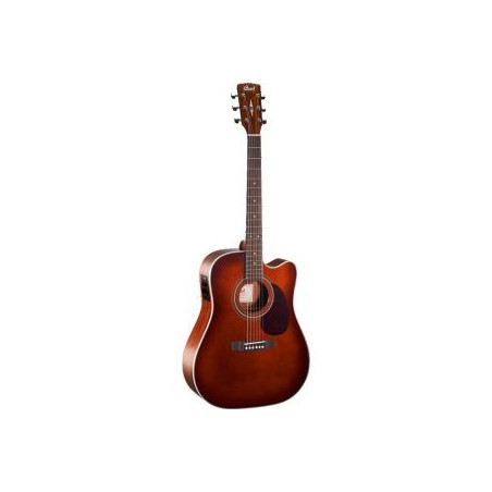 GUITARRA ELECTROACUSTICA DE 6 CUERDAS CON CUTAWAY Guitarra acustica electrificada tipo Dreadnought con cutaway. Tapa solida de abeto. Aros, fondo y mástil de caoba. Diapasón y puente de palo rosa. 20trastes. Escala 25.3'. Pastilla ceramica. Previo CORT CE304T EQ. Acabado Brown Burst.