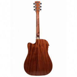 GUITARRA ELECTROACUSTICA DE 6 CUERDAS CON CUTAWAY Guitarra acustica electrificada tipo Dreadnought con cutaway. Tapa solida de abeto. Aros, fondo y mástil de caoba. Diapasón y puente de palo rosa. 20trastes. Escala 25.3'. Pastilla Fishman Matrix. Previo Fishman Prefix Plus T. Acabado Natural Glossy.