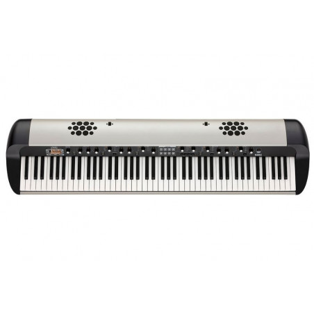 PIANO DIGITAL Piano digital de escenario, serie Stage Vintage. El SV-2 contiene más de diez veces los datos de muestras disponibles en modelos SV anteriores, pro-porcionando una amplia memoria para muchos sonidos de piano y teclados totalmente nuevos. El SV-2 dispone de 72 sonidos excelentes, y proporciona 64 ubicaciones de memoria para almacenar Favori-tos editados, para un acceso instantáneo durante tu interpretación. Usando el software SV-2 Editor, los usuarios ahora pueden crear sus propios programas, divididos y en capas, y guardarlos en una de las ubicaciones de Favoritos. De hecho, un solo favorito puede acceder a hasta tres timbres a la vez: una división de piano/bajo con una capa de cuerdas, por ejemplo. Aunque las divisiones de usuario deben crearse utilizando el Editor SV-2, el punto de división en el teclado se puede ajustar directamen-te desde el panel frontal. Además, la polifonía del SV-2 ahora alcanza las 128 voces, lo que permite crear capas de sonidos más efectivas o acordes sostenidos.