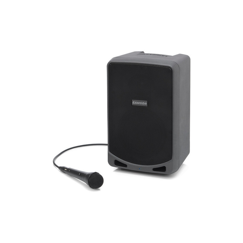 ALTAVOZ CON BATERÍA RECARGABLE Caja compacta portátil autoamplificada de 2 vías de 100W. 1 x 6'' y 1 x 1''. Dispone de mezclador de 1 canal mic/linea (Combo), 1 canal linea estéreo(Jack 1/4', Jack 1/8'), 1 canal Bluetooth. Microfono incluído. Batería recargable (20h autonomía uso contínuo). Entrada USB para sistema de microfonia inalámbrica Samson XPD (no incluido). Ideal parapequeñas presentaciones. Color negro.