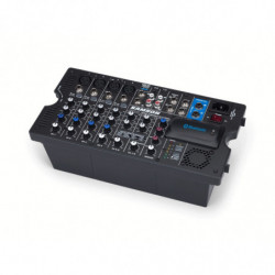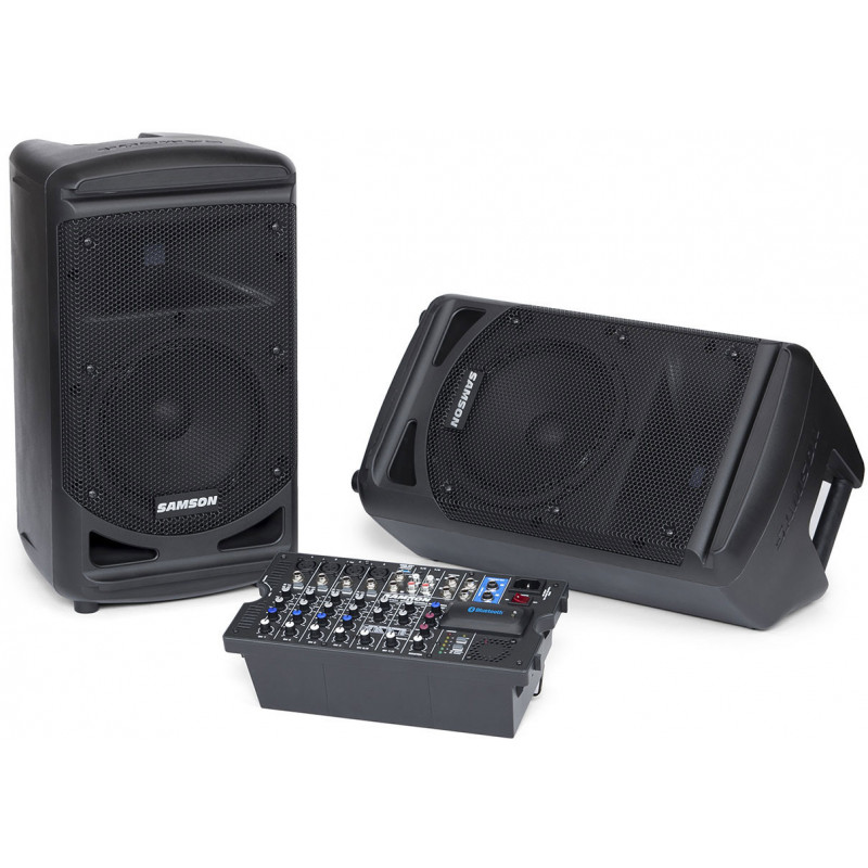 EQUIPO DE SONIDO COMPLETO Equipo portátil compuesto por 2 cajas de 8''+1'' y mezclador con etapa de potencia incorporada de 2x 400W pico. Polivalente: eventos al aire libre, teatros, salas de conferencia, etc. El mezclador incorpora ocho canales: 4 canales micro/línea y 2 canales estéreo, incorpora unidad de efectos y conexión Bluetooth así como USB para sistema de microfonia inalámbrica USB Samson XPD, vendida por separado.