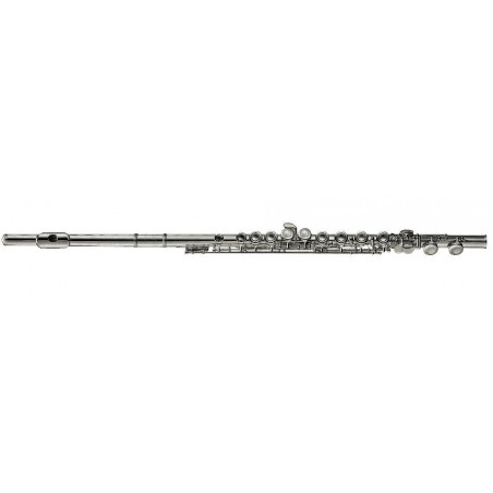 Flauta en Do. Plateado. Labio de plata. Platos abiertos y desalineados. Mecanismo de MI. Con estuche.